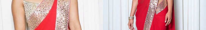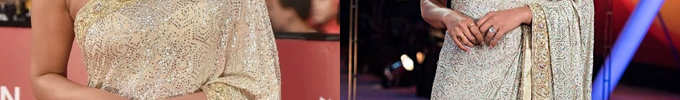 Dazzling us with some ivory and gold, Priyanka selected this mukaish-work sari by Abu Jani Sandeep Khosla for an occasion. Embroidered with jaali work and coated in gold zardozi bordered, she teamed her sari with a strapless shirt. The actress accomplished her look with dewy make-up and an announcement diamond neckpiece.
