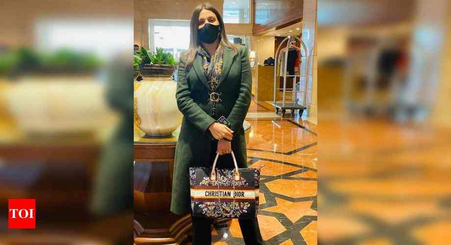 Esha Gupta surprised in a Gulab/berry pink paisley-print sari robe paired with a pearl embellished belt.