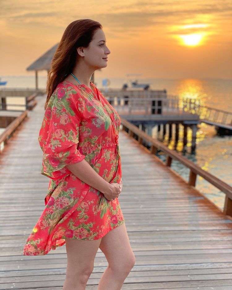 Actor Dia Mirza confirmed off her pins in a printed maxi gown and flaunting her child bump.